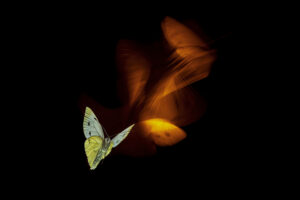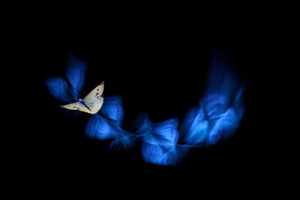 À travers un travail de pose longue et d’éclairage minutieux, j’ai tenté de suivre ces chorégraphies naturelles qui n’obéissent à aucune logique humaine. Ces mouvements d’ailes deviennent alors des traits de lumière, des calligraphies en suspension, comme si le papillon dessinait dans l’air les contours d’un langage magique et secret : celui des fées.